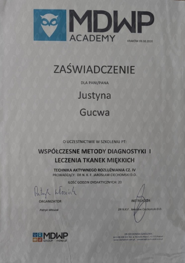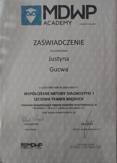 • 18.07.2020 – kurs – moduł 5 - Dysbalans mięśniowo–powięziowy – prowadzący dr n. k. f. Jarosław Ciechomski D. O