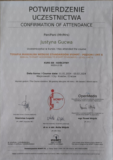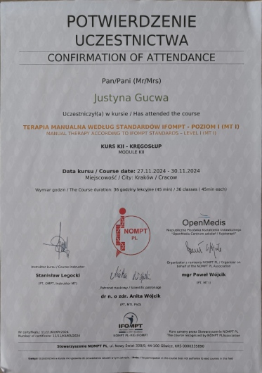 Pani Justyna jest świetnym, empatycznym specjalistą. Profesjonalne podejście, dokładny wywiad oraz trafne podsumowanie badań sprawiły, że od razu poczułam się zaopiekowana. Ćwiczenia i zalecenia zostały jasno wytłumaczone. Zdecydowanie polecam – na pewno jeszcze nie raz skorzystam z pomocy tego specjalisty.