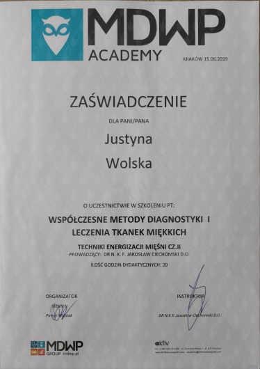• 15.06.2018 – kurs – moduł 2 - Techniki Energizacji Mięśni część II - prowadzący dr n. k. f. Jarosław Ciechomski D. O
