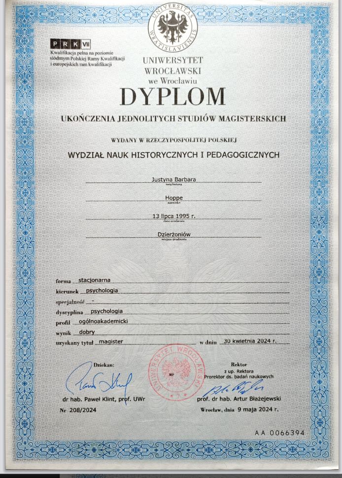 Jaki jest zakres porad oferowanych przez Justyna Hoppe?Justyna Hoppe to psycholog. Na podstawie swojego doświadczenia i wykształcenia Justyna Hoppe oferuje usługi takie jak: konsultacja online, coaching, psychoedukacja, konsultacja psychologiczna (kolejna wizyta), konsultacja telefoniczna, interwencja kryzysowa, Konsultacja psychologiczna online, psychoterapia indywidualna, Psychoterapia, konsultacja psychoterapeutyczna.