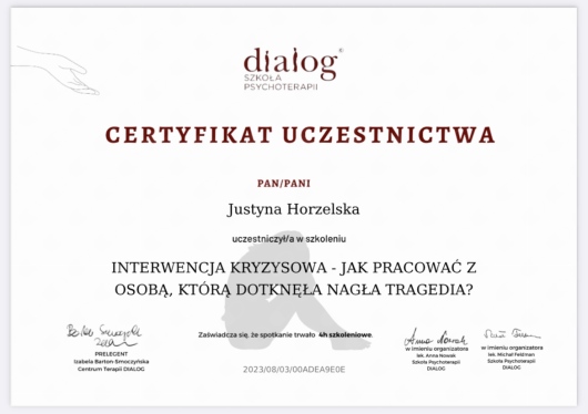 Pani Justyna Horzelska to wyjątkowa psycholog z ogromnym zaangażowaniem i empatią. Już od pierwszego spotkania stworzyła atmosferę pełną zaufania i zrozumienia, co bardzo ułatwiło mi otwarcie się i podjęcie pracy nad sobą. Jej profesjonalizm, ciepło i uważność sprawiły, że każda wizyta była dla mnie wartościowym doświadczeniem. Dzięki jej wsparciu udało mi się spojrzeć na wiele spraw z nowej perspektywy i poczynić realne postępy. Gorąco polecam panią Justynę każdemu, kto szuka mądrej i życzliwej specjalistki.