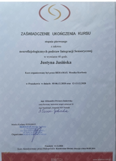 ● Kurs Integracji Sensorycznej, I i II stopień, Pruszków 2020 r., 2021 r.,