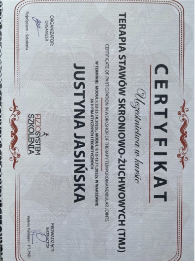 ● Terapia stawów skroniowo-żuchwowych (TMJ), FizjoSystem, Warszawa 2022 r.,