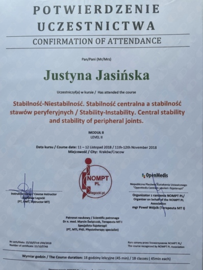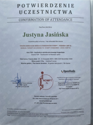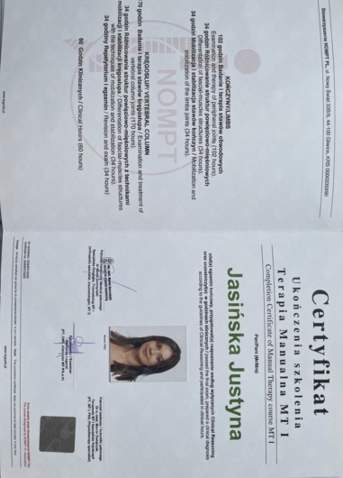 ● Certyfikowany Terapeuta Manualny wg standardów IFOMPT MT I, (10 modułów), (Prowadzący: Instruktor MT e.V. IFK, PT/OMT Stanisław Legocki) (moduł EB-kończyny 01.2018 r., moduł EII-kończyny 05.2018 r., moduł KI- kręgosłup 09.2018 r., moduł KII-kręgosłup 12.2018 r., moduł EIII-kończyny 03.2019 r., moduł EM-kończyny 06.2019 r., moduł KIII-kręgosłup 09.2019 r., moduł KIV-kręgosłup 12.2019 r., moduł KM-kręgosłup 03.2020 r., EGZAMIN 06.2020 r.),