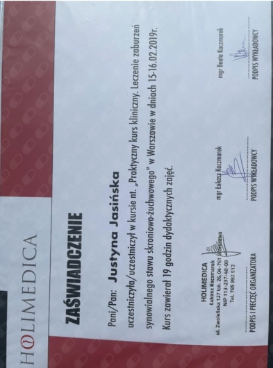 W czasie pierwszej wizyty pomimo moich licznych dolegliwości i zaburzeń w zakresie układu kostno-mięśniowego pani Justyna, bardzo dokładnie mnie zbadała, zapoznała się z wynikami badań radiologicznych i MRI, diagnozowała przyczyny zaburzeń, wyjaśniła ich mechanizmy oraz dobrała odpowiednie ćwiczenia, które opanowałam w czasie wizyty i teraz systematycznie powtarzam w domu do czasu kolejnej wizyty. Po kilku dniach widzę efekty - zmniejszenie patologicznej lordozy. Cieszę, że trafiłam do pani Justyny.