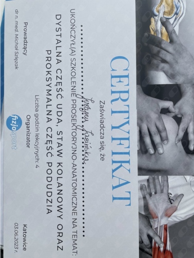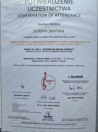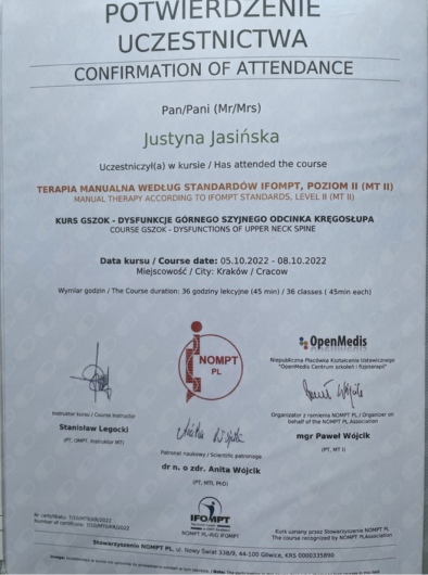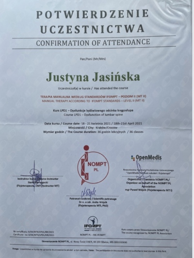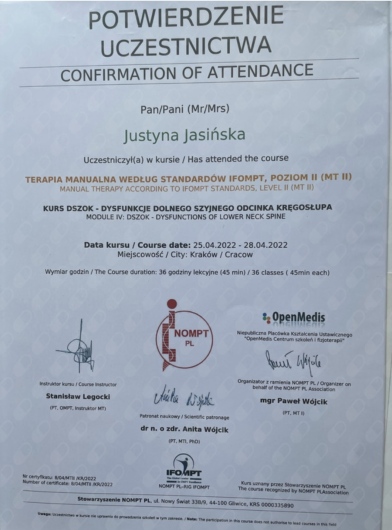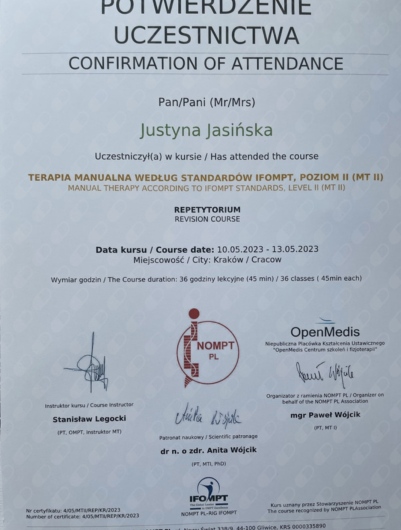 ● Terapia Manualna wg standardów IFOMPT, NOMPT PL, Moduły doszkalające MT II, Kraków (Prowadzący: Instruktor MT e.V. IFK, PT/OMT Stanisław Legocki) - w trakcie, (moduł VI 04.2023 r. – Repetytorium; moduł V GSZOK 10.2022 r. Dysfunkcje Górnego odcinka szyjnego; moduł IV DSZOK 04.2022 r. Dysfunkcje przejścia odcinka szyjno-piersiowego kręgosłupa i kończyny górnej; moduł III LPD2 10.2021 r. Dysfunkcje kompleksu miedniczno-udowego i kończyny dolnej; moduł II LPD1 04.2021 r. Dysfunkcje regionu lędźwiowego odcinka kręgosłupa i kończyny dolnej; moduł I TOK 11.2020 r. Dysfunkcje piersiowego odcinka kręgosłupa.)