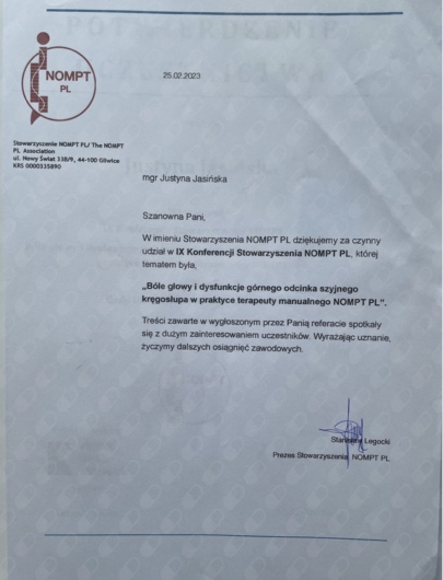 Wystąpienie: “Ból głowy jako częsta, wtórna klasyfikacja (wtórny objaw) w praktyce fizjoterapeuty, terapeuty manualnego NOMPT. Studium przypadków.