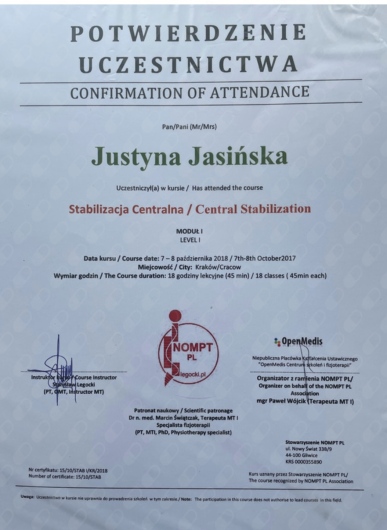 ● Stabilizacja kręgosłupa szyjnego i stawów skroniowo-żuchwowych, NOMPT PL, Kraków 2018 r.,