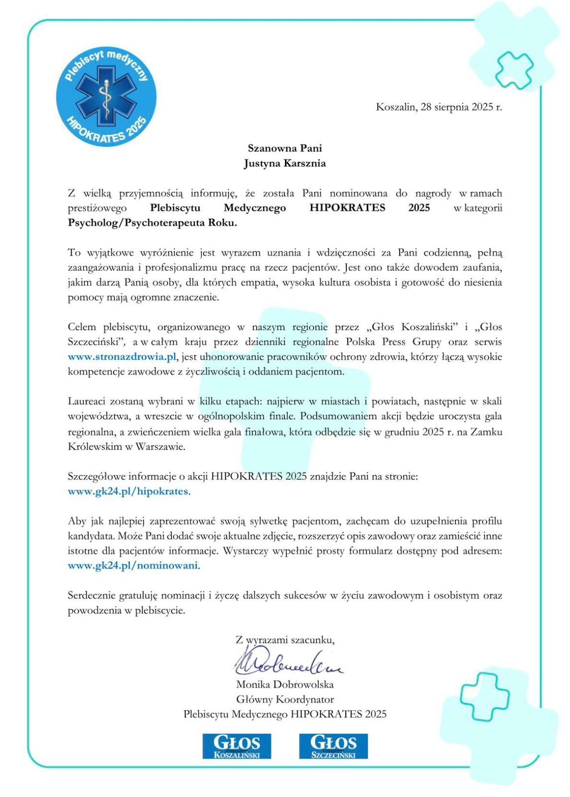 Zostałam nominowana w plebiscycie Hipokrates 2025 w kategorii Psycholog/Psychoterapeuta Roku.