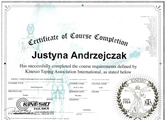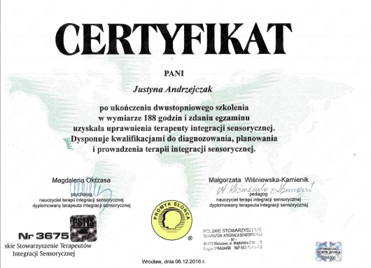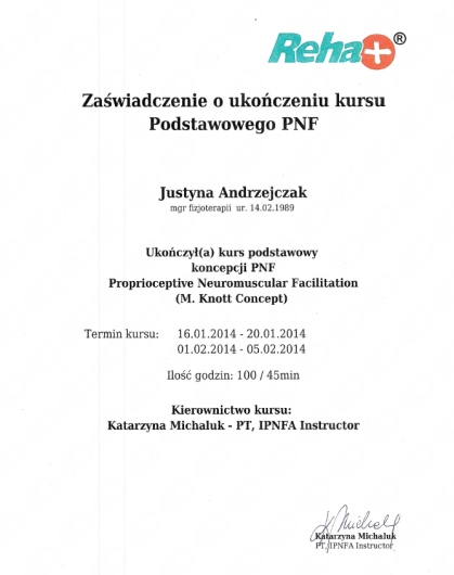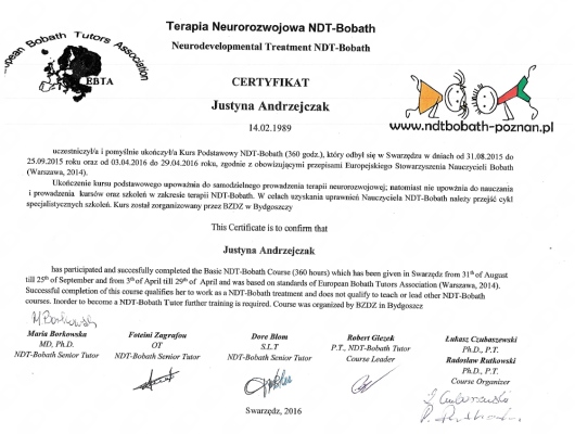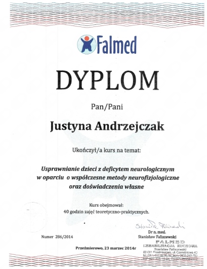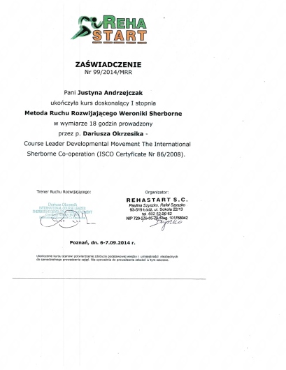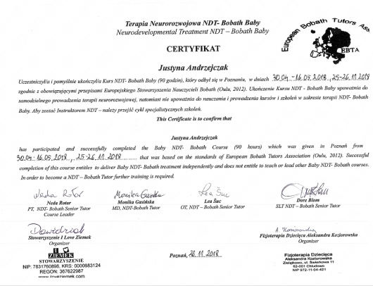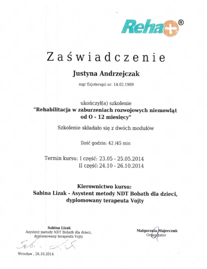 Absolwentka fizjoterapii na AWF w Poznaniu, uczestniczka wielu kursów rehabilitacyjnych dotyczących neurorozwoju dzieci. Pracuje z dziećmi usprawniając je od 2013r. Jest certyfikowanym terapeuta NDT-Bobath Baby, integracji sensomotorycznej, metody FITS, trojpaszczyznowej terapii stóp oraz jest instruktorem pływania niemowlat i małych dzieci.