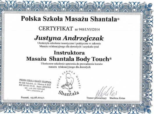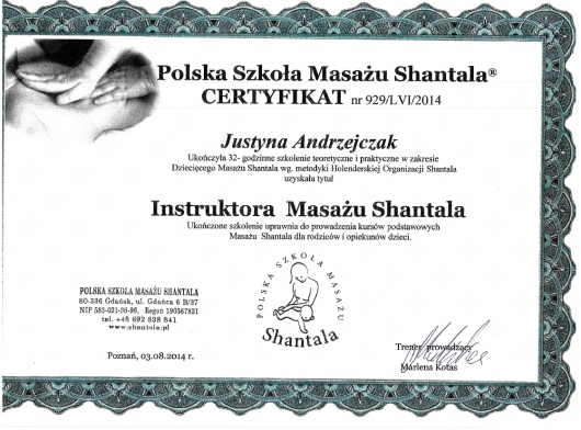 Pani Justyna jest bardzo ciepłą i serdeczną osobą, ma przyjacielskie podejście do dzieci. Potrafiła b.szybko przekonać do siebie mojego syna, który z natury jest dość mocno wycofany społecznie i niechętnie wchodzi w relacje z nowopoznanymi osobami. Podziwiam jej niesamowitą cierpliwość, otwartość a także poczucie humoru (rybki i rekiny, które próbują nas zrzucić z wałka do ćwiczeń oraz klamerki wspominamy z uśmiechem na buzi ;) )