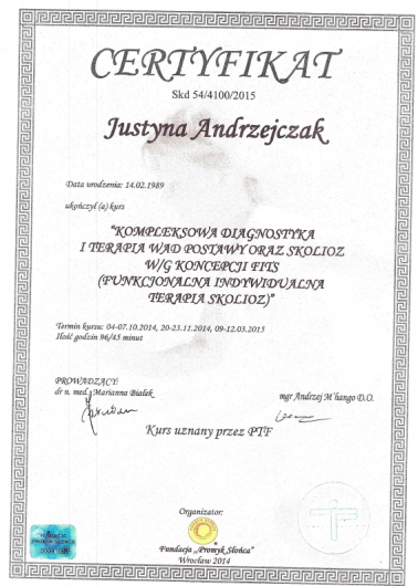 Nigdy nie spotkałam osoby tak zaangażowanej w swoją pracę jak Pani Justyna. Do Jej gabinetu przychodziłam z synkiem(9lat). Za każdym razem Pani Justyna wnikliwie oceniała postawę syna i wykonywała z nim ćwiczenia dostosowane do aktualnej sytuacji zdrowotnej. Dostawaliśmy też zestaw ćwiczeń, które mogliśmy wykonywać w domu.