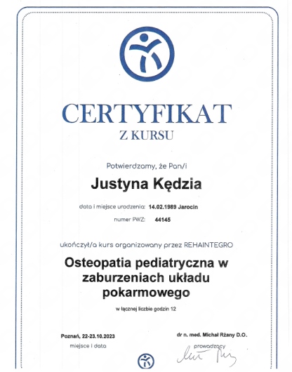 Pani Justyna to cudowna osoba i specjalista. Ma bardzo dobre podejście do dzieci. Na wizycie wszystko dokładnie tłumaczy i pokazuje również jak wykonywać ćwiczenia w domu, co przynosi szybko widoczne efekty. Dzięki rehabilitacji u pani Justyny nasz synek osiąga kolejne kamienie milowe w rozwoju. Wcześniej chodziliśmy do pani Justyny także z córką. Jest to osoba godna zaufania, którą z czystym sumieniem polecam.