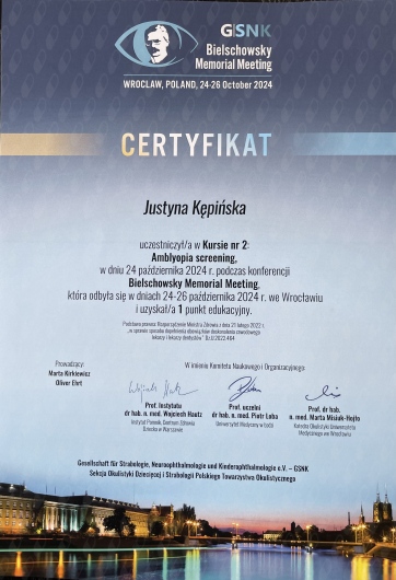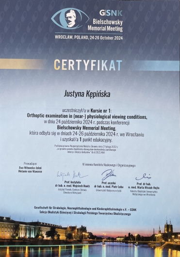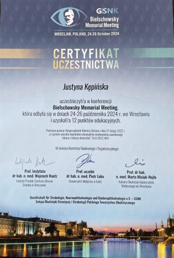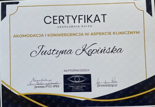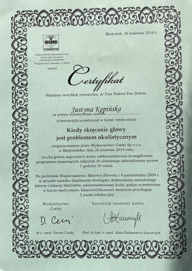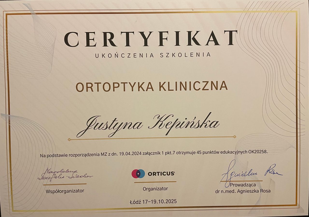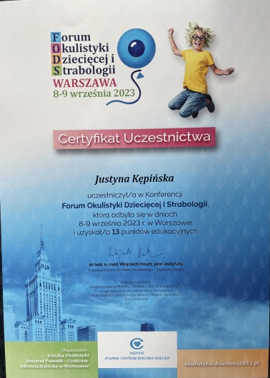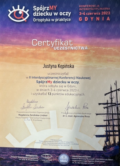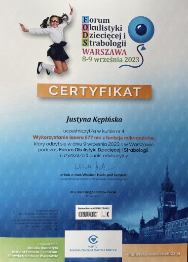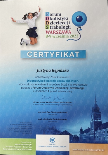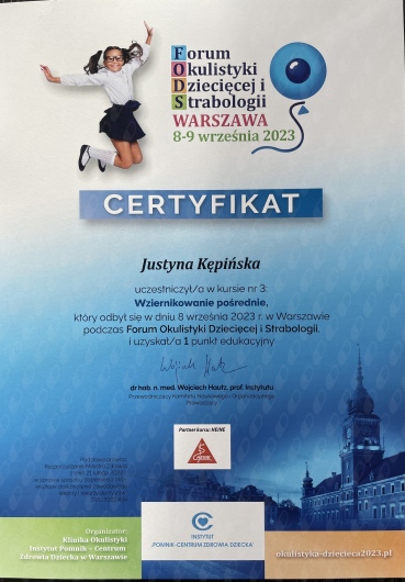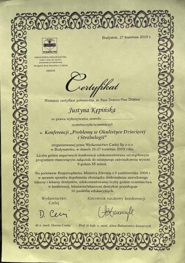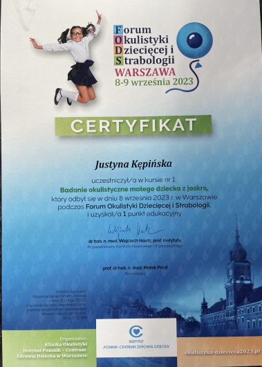 Swoją wiedzę z okulistyki systematycznie poszerzam uczestnicząc w konferencjach oraz szkoleniach. Przyjmuję dzieci.