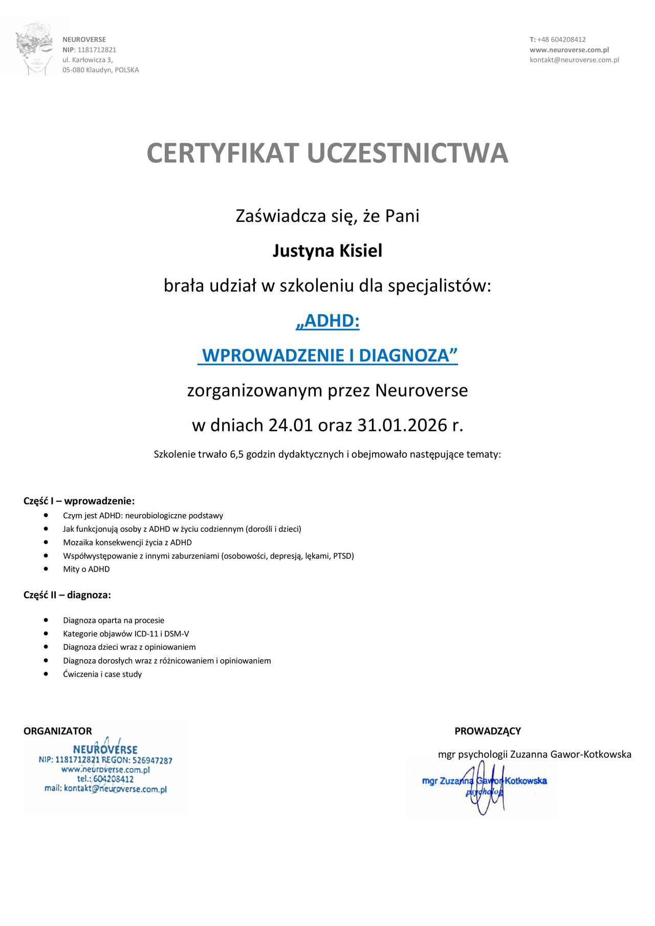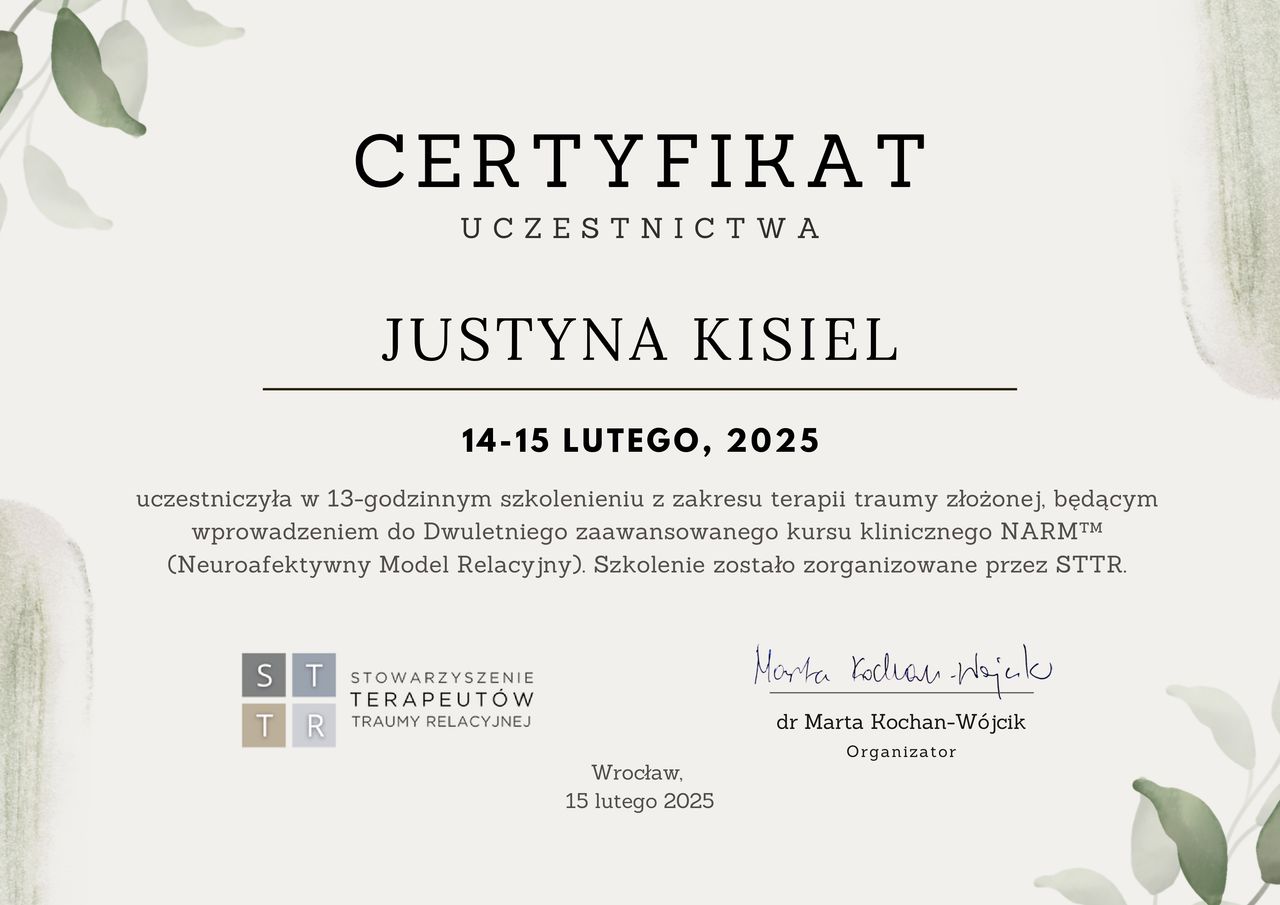 Odbyłam 300-godzinne szkolenie psychoterapeutyczne w Polskim Instytucie Ericksonowskim w Łodzi. Ukończyłam całościowe (1020 godzin), czteroletnie szkolenie psychoterapeutyczne w krakowskim Ośrodku Szkoleń Systemowych. Ukończyłam studia podyplomowe z psychotraumatologii na Uniwersytecie Gdańskim.