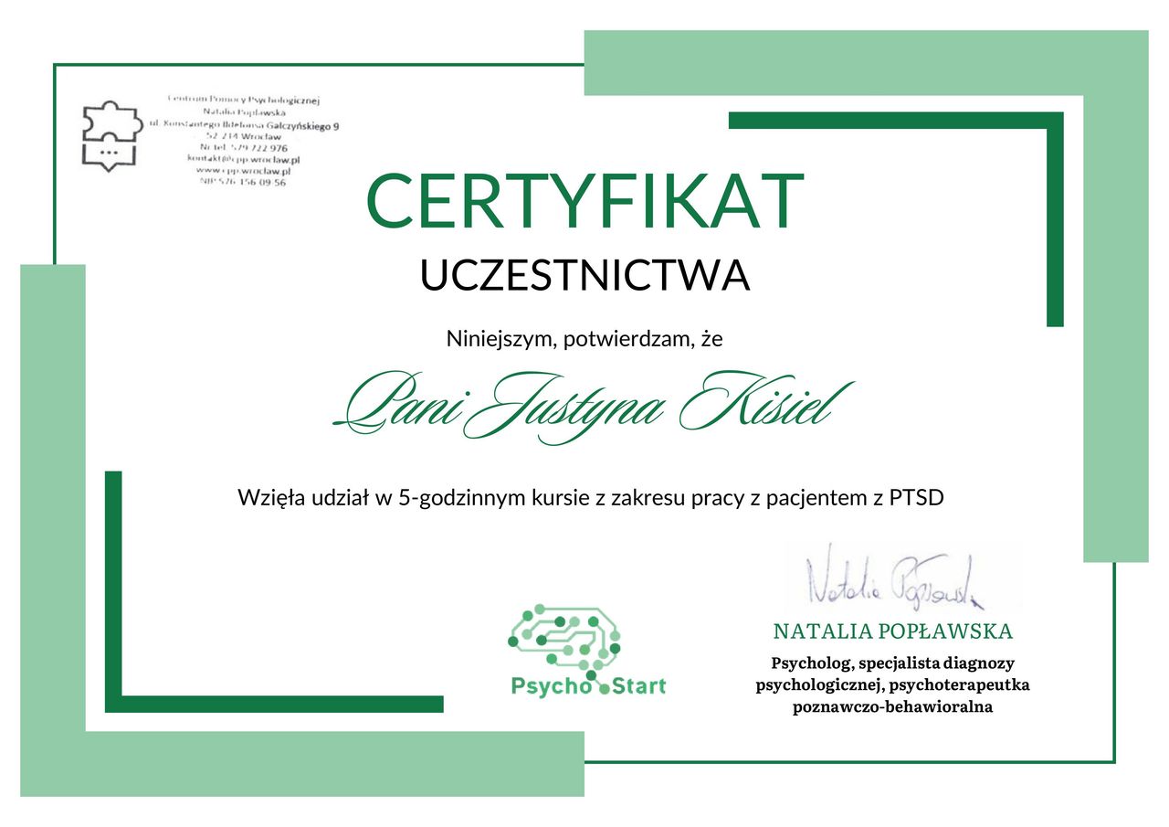 Pani Justyna to niezwykle empatyczna i ciepła osoba. Już od pierwszych spotkań czułam się przy niej bezpiecznie i zrozumiana. Potrafiła w delikatny, ale bardzo trafny sposób normalizować moje doświadczenia, dzięki czemu z każdą wizytą czułam, że naprawdę wzrastam i uczę się lepiej rozumieć siebie. Jej profesjonalizm idzie w parze z autentyczną życzliwością, co sprawia, że każda rozmowa z nią była dla mnie ogromnym wsparciem. Z całego serca polecam Panią Justynę każdemu, kto szuka mądrej i empatycznej terapeutki.