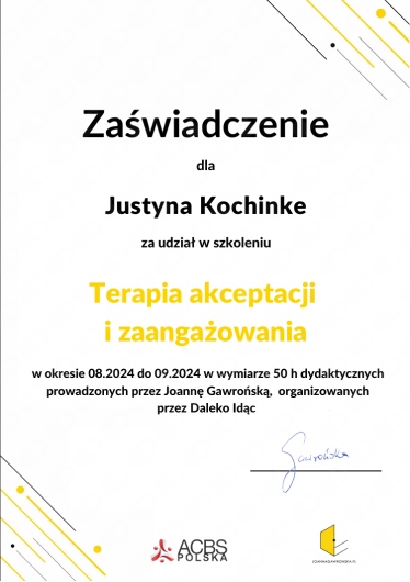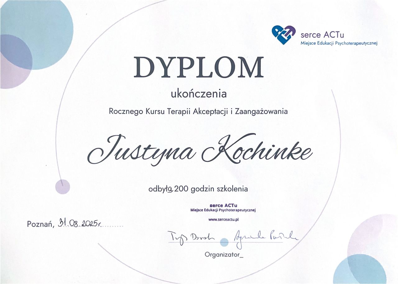 Jestem psychologiem w trakcie szkolenia psychoterapeutycznego. Ukończyłam jednolite studia magisterskie na Uniwersytecie SWPS w Poznaniu, aktualnie realizuję całościowe certyfikowane szkolenie psychoterapeutyczne w Szkole Psychoterapii Integratywnej Serce ACTu. Ukończyłam roczny kurs Terapii Akceptacji i Zaangażowania (ACT).