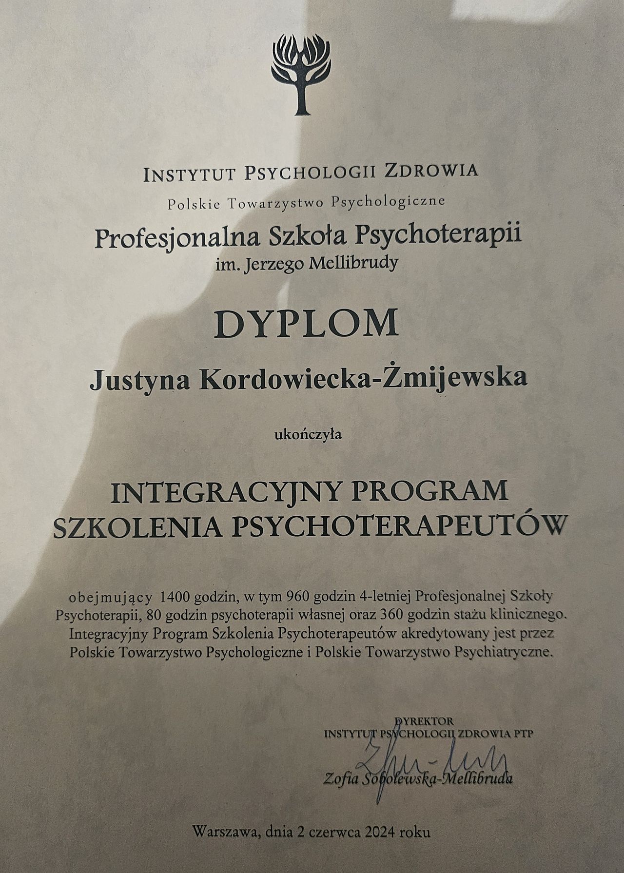 Pani Justyna jest również psychoterapeutą integracyjnym, co oznacza, że potrafi dostosować metodę pracy do indywidualnych potrzeb pacjenta, wykorzystując podejścia takie jak terapia skoncentrowana na rozwiązaniach (TSR), racjonalna terapia zachowań (RTZ) oraz inne nowoczesne metody terapeutyczne. Pomaga osobom zmagającym się z: