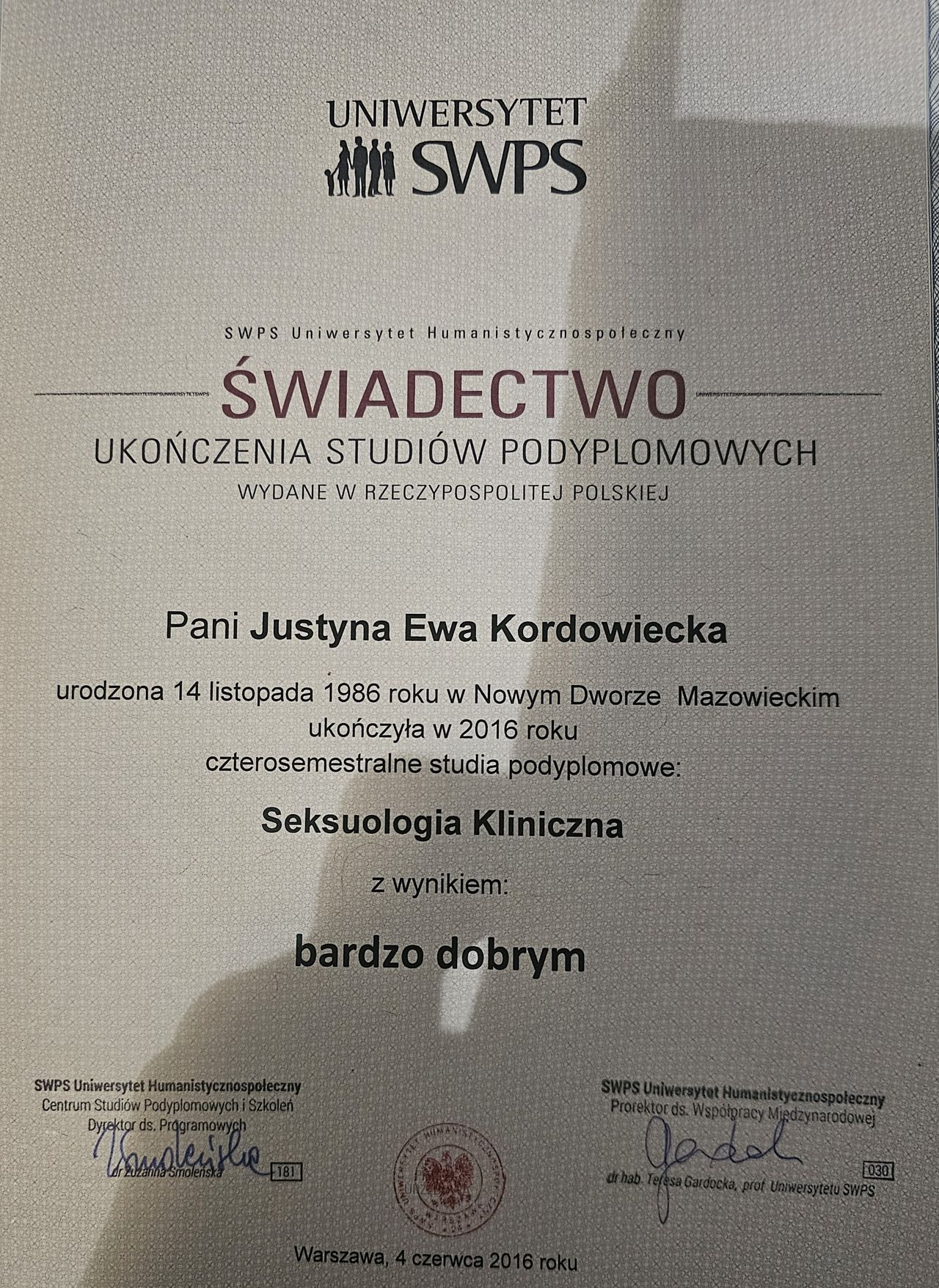 Pani Justyna Kordowiecka-Żmijewska specjalizuje się w zakresie seksuologii, psychoterapii integracyjnej oraz opiniowania sądowego, a także oferuje pomoc w ustalaniu tożsamości płciowej. Jej bogate doświadczenie i wykształcenie pozwalają jej na kompleksowe podejście do każdego pacjenta.
