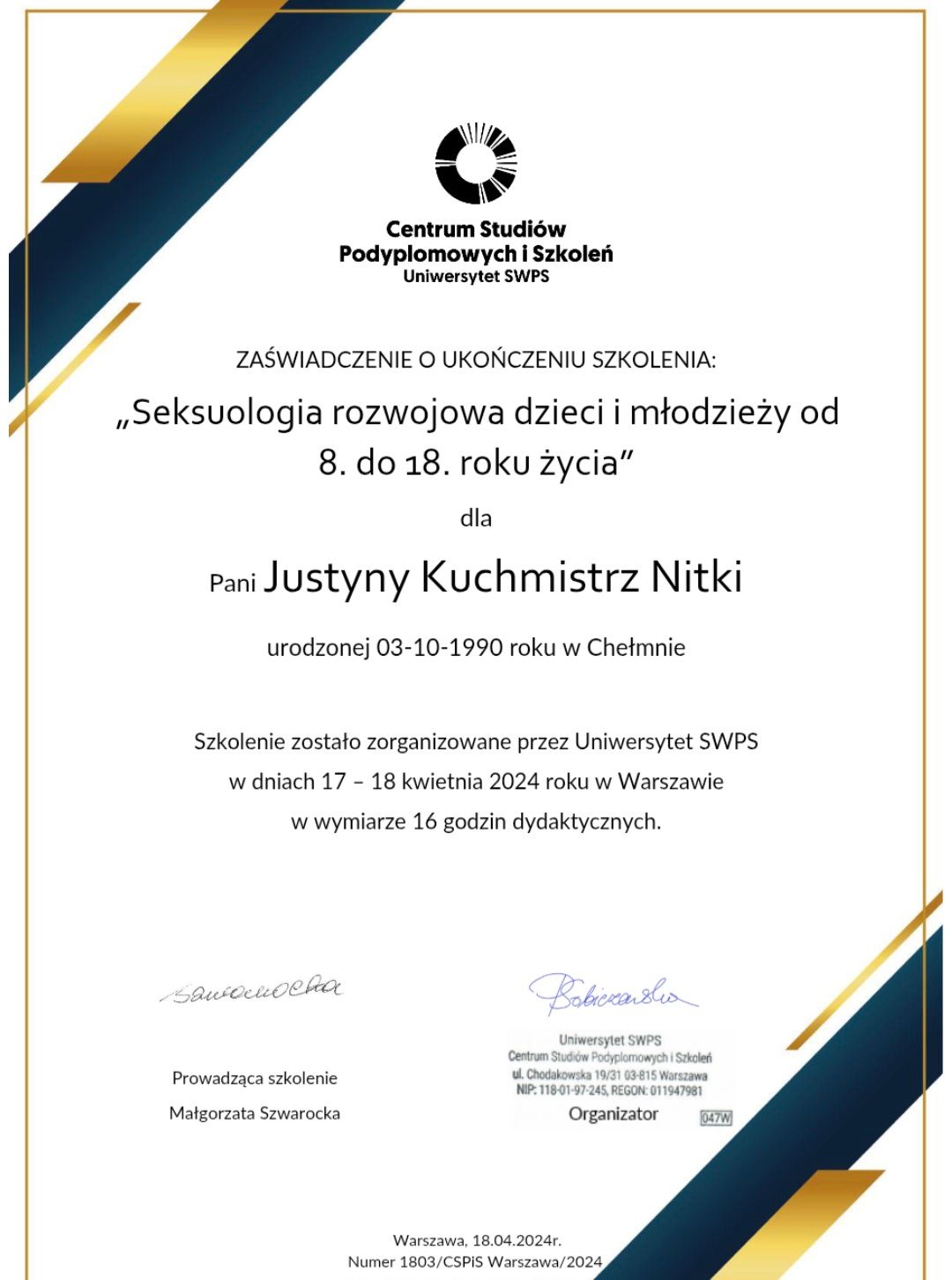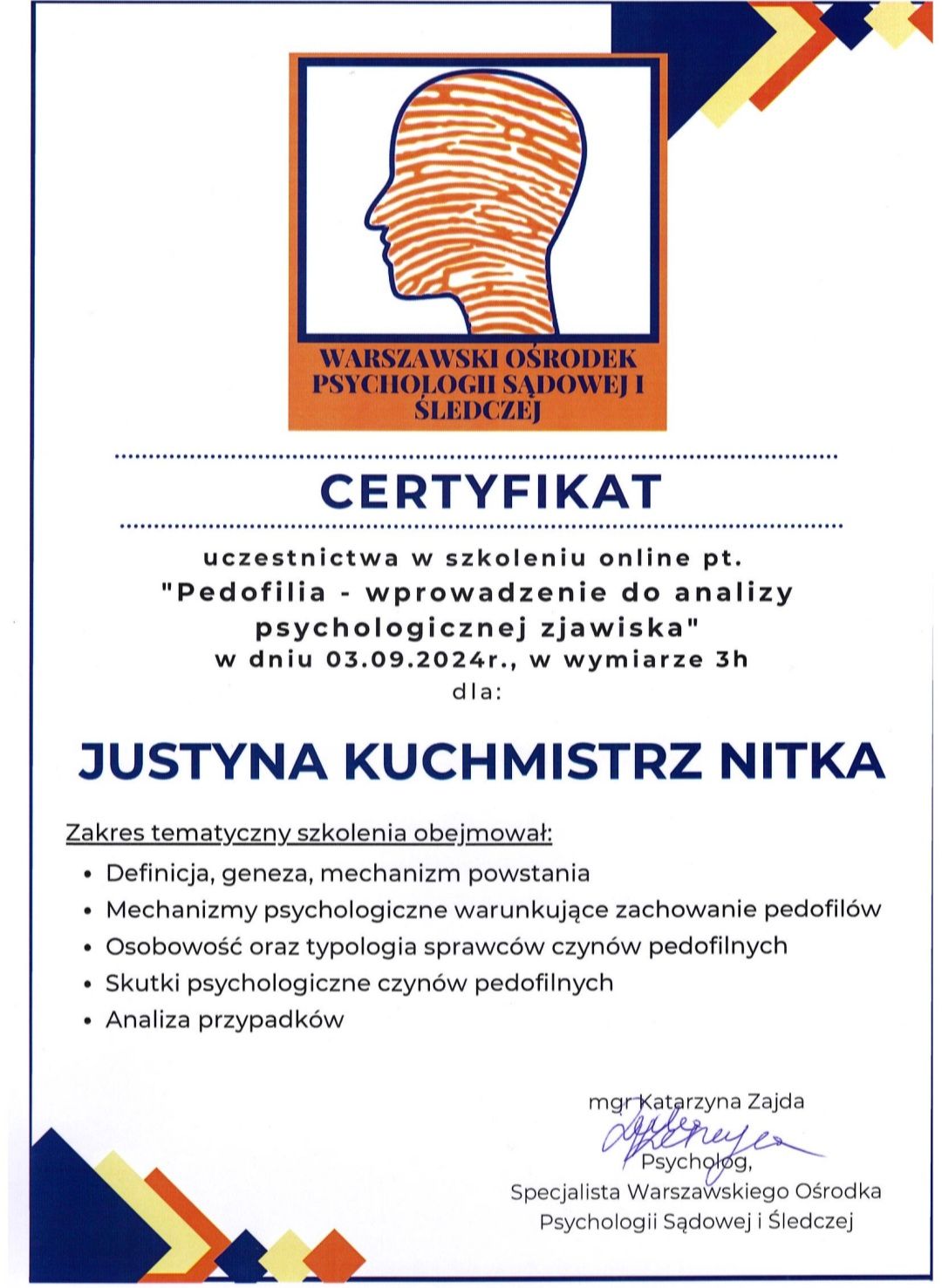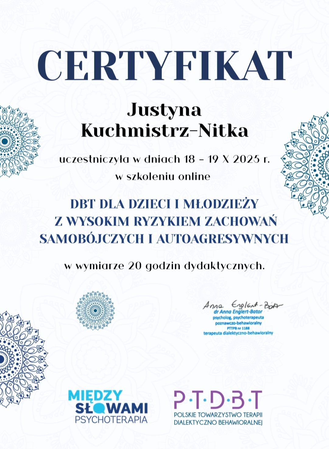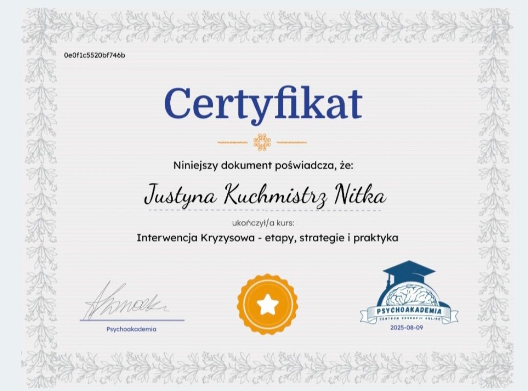Pani Justyna jest osobą bardzo empatyczną, ciepłą i uważną. Potrafi wysłuchać bez oceniania. Daje poczucie bezpieczeństwa już od pierwszego spotkania. Na każdą sesję przychodzi bardzo przygotowana, pamięta szczegóły z poprzednich spotkań. Atmosfera na terapii jest przyjazna i sprzyjająca w pracy nad sobą.