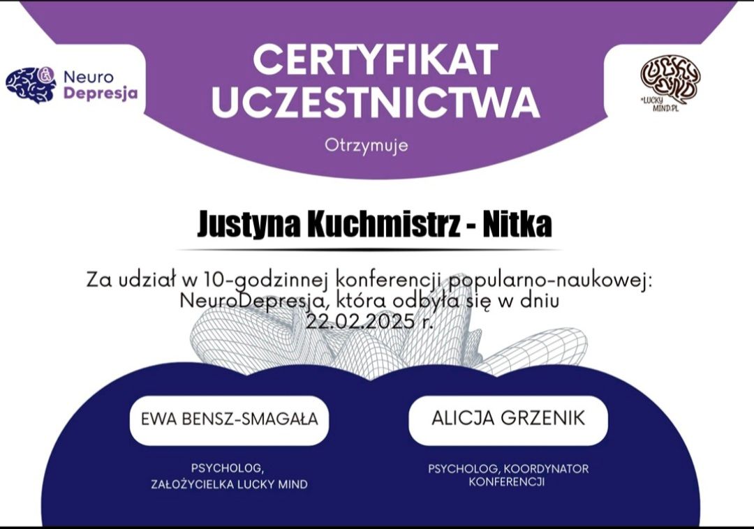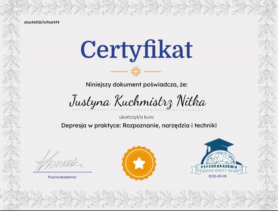 Z całego serca polecam Panią Justynę. Trafiłam do niej w trudnym okresie związanym z depresją i od samego początku czułam się bezpiecznie, wysłuchana i zrozumiana. Jest niezwykle empatyczna, uważna i profesjonalna. Spotkania odbywały się w atmosferze spokoju i akceptacji, bez oceniania. Terapia pomogła mi lepiej zrozumieć siebie, swoje emocje i stopniowo odzyskać równowagę. Jestem bardzo wdzięczna za wsparcie, cierpliwość i realną pomoc.