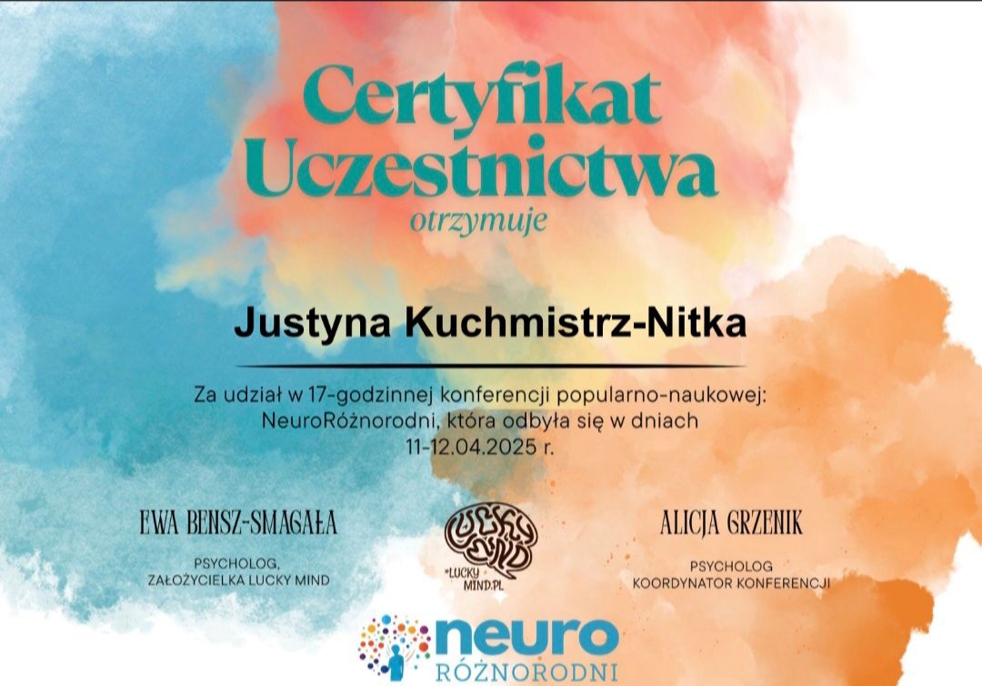 Bliska jest mi praca z osobami neuroatypowymi – zwłaszcza z ADHD i w spektrum autyzmu – którym towarzyszę zarówno w terapii, jak i w rozwoju osobistym.
