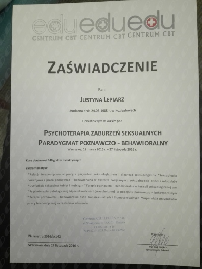 Jaki jest zakres porad oferowanych przez Justyna Lepiarz?Justyna Lepiarz to psychoterapeuta, seksuolog, psycholog. Na podstawie swojego doświadczenia i wykształcenia Justyna Lepiarz oferuje usługi takie jak: Konsultacja psychologiczna, konsultacja seksuologiczna, psychoterapia partnerska, psychoterapia indywidualna, psychoterapia zaburzeń lękowych, Psychoterapia zaburzeń obsesyjno-kompulsyjnych OCD, psychoterapia depresji, psychoterapia depresji online, psychoterapia depresji poporodowej, psychoterapia dorosłych.