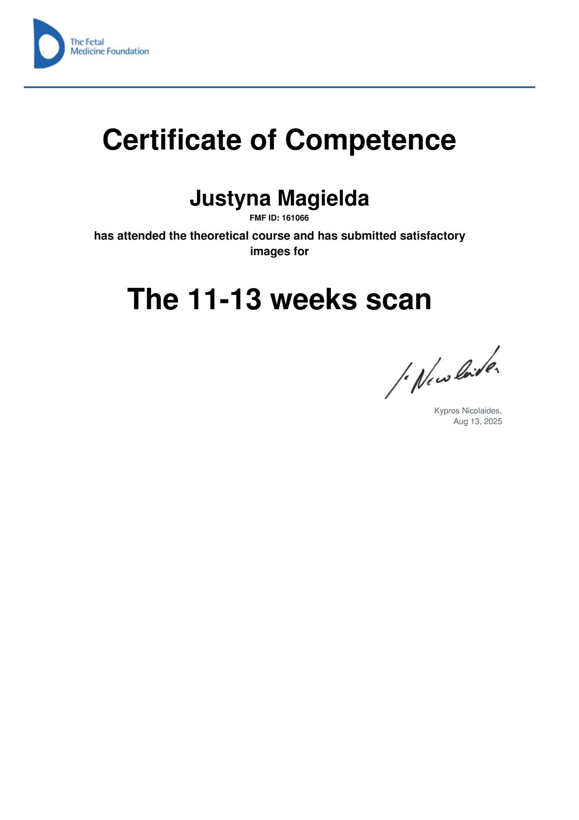 Posiadam certyfikat PTGiP w zakresie wykonywania badań prenatalnych oraz certyfikat FMF nr 161066 w zakresie wykonywania badań USG 11-14 t.c.