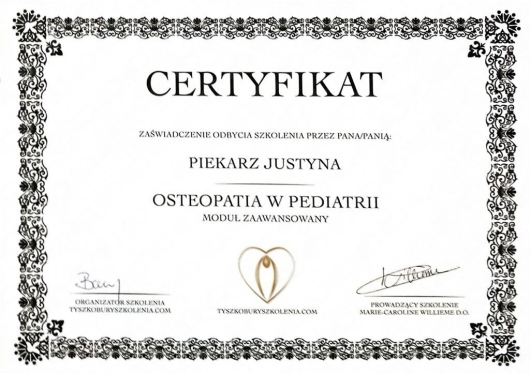 Jaki jest zakres porad oferowanych przez Justyna Piekarz?Justyna Piekarz to fizjoterapeuta, osteopata. Na podstawie swojego doświadczenia i wykształcenia Justyna Piekarz oferuje usługi takie jak: osteopatia (kolejna wizyta), Fizjoterapia z wykorzystaniem technik osteopatycznych, Osteopatia kobiet w ciąży, osteopatia pediatryczna, osteopatia dziecięca, osteopatia (pierwsza wizyta, diagnoza, badanie + wstępny zabieg), osteopatia (pierwsza wizyta), Fizjoterapia stomatologiczna (pierwsza wizyta), fizjoterapia kobiet w ciąży / fizjoterapia okołoporodowa (pierwsza wizyta), konsultacja fizjoterapeuty - rehabilitacja manualna (pierwsza wizyta).