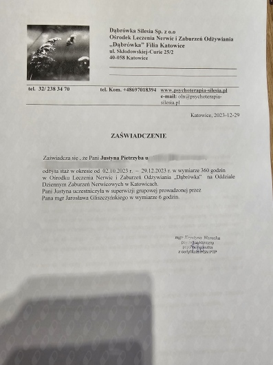 Doświadczenie zawodowe zdobywałam podczas stażu na oddziale ogólnopsychiatrycznym oraz na oddziale terapeutycznym w Centrum Psychiatrii w Katowicach. Odbyłam również staż w oddziale Leczenia Nerwic i Zaburzeń Odżywania w Ośrodku Psychoterapii Dąbrówka w Katowiach.