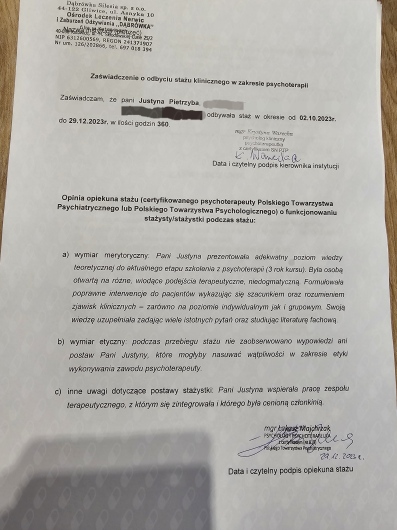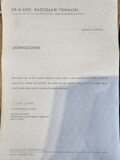 Swoją pracę poddaję regularnej superwizji u certyfikowanych superwizorów PTP. Stale podnoszę swoje kompetencje uczestnicząc w kursach i szkoleniach. Jestem członkiem Polskiego Towarzystwa Psychiatrycznego. W swojej pracy zawodowej kieruję się Kodeksem Etycznym Psychoterapeuty.