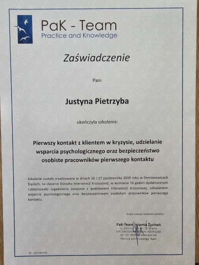 Jestem psycholożką i psychoterapeutką w trakcie całościowego szkolenia z psychoterapii atestowanego przez Sekcję Naukową Polskiego Towarzystwa Psychiatrycznego, które umożliwi mi uzyskanie Certyfikatu Psychoterapeuty PTP. Szkolę się w Śląskiej Szkole Psychoterapii w podejściu psychodynamicznym i w psychodramie. Ukończyłam również szkolenie Terapii Skoncentrowanej Na Rozwiązaniach