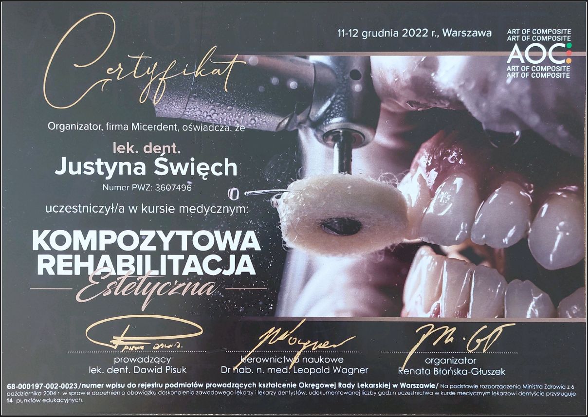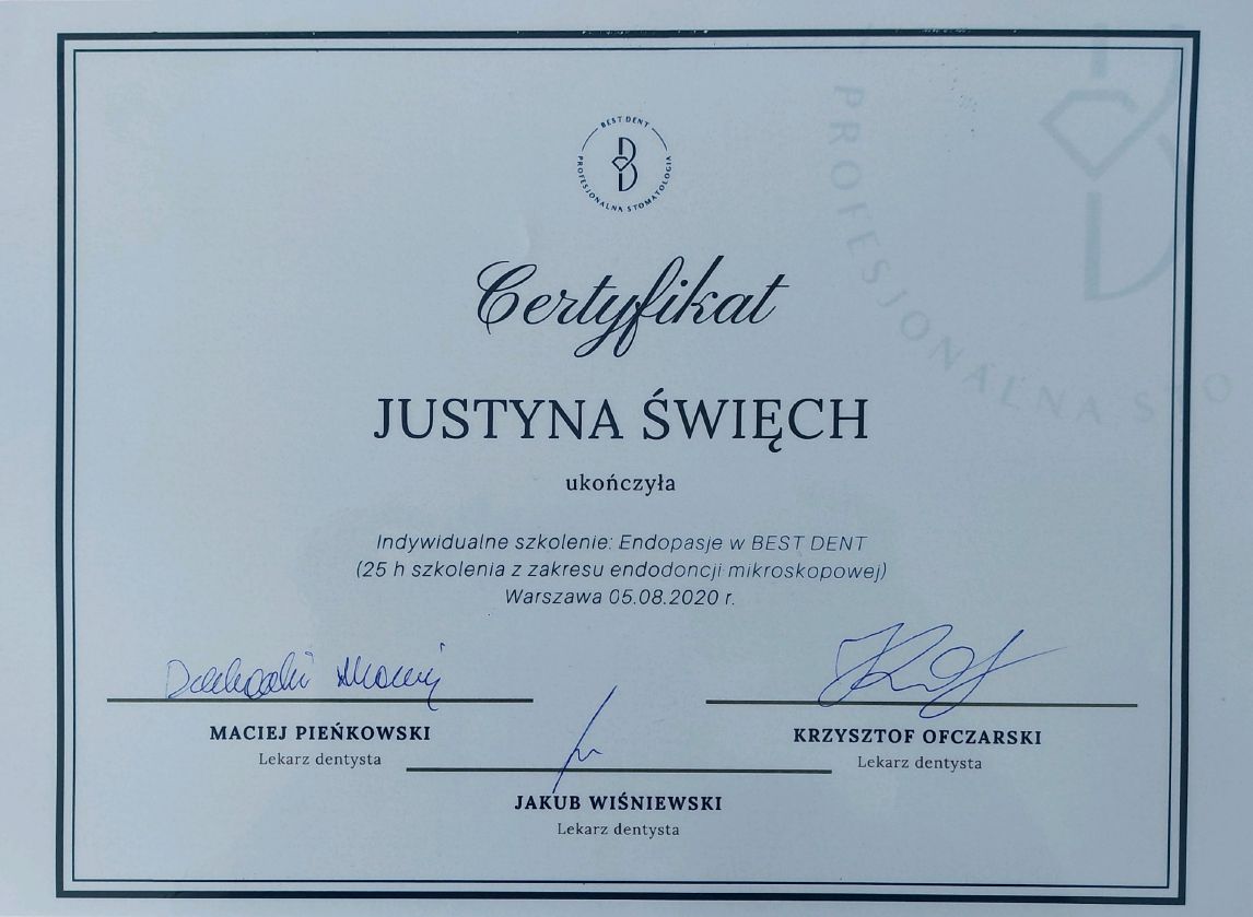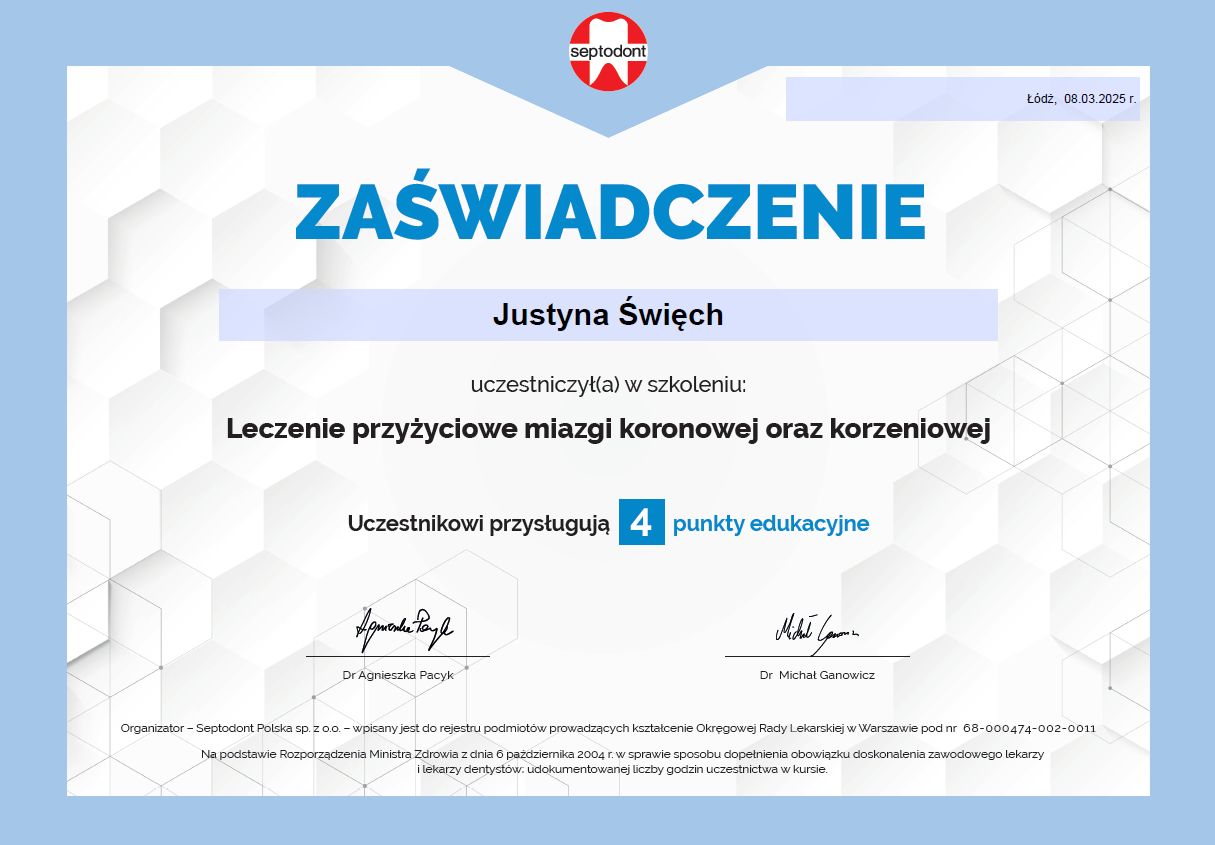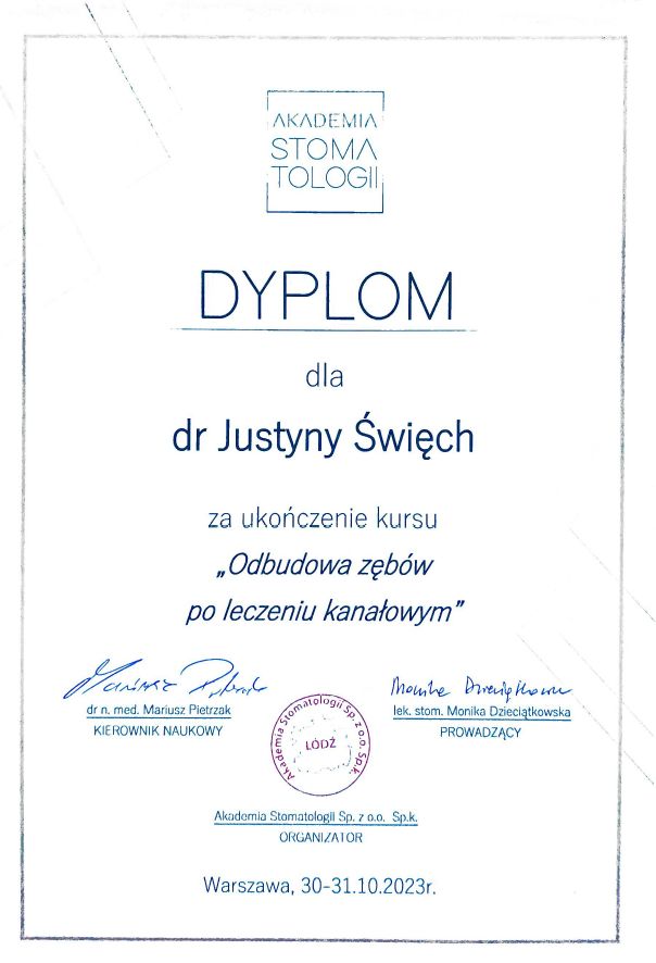 Pani doktor Justyna Święch leczyła mnie jeszcze gdy była w Warszawie, w gabinecie mjkstomatologia. Co mnie w niej urzekło, to fakt, że nie owija w bawełnę – przy każdej wizycie kulturalnie udzielała mi reprymendy, że nie nitkuję zębów. Ale robiła to z troski, a gdy doszło do leczenia (próchnica na siódemce) to wszystkie zabiegi zrobiła bardzo profesjonalnie i z zębem nie mam dzisiaj żadnych problemów.