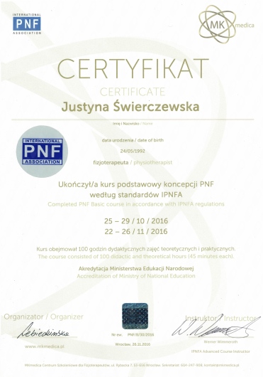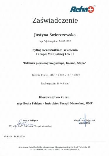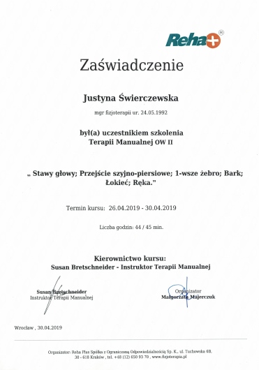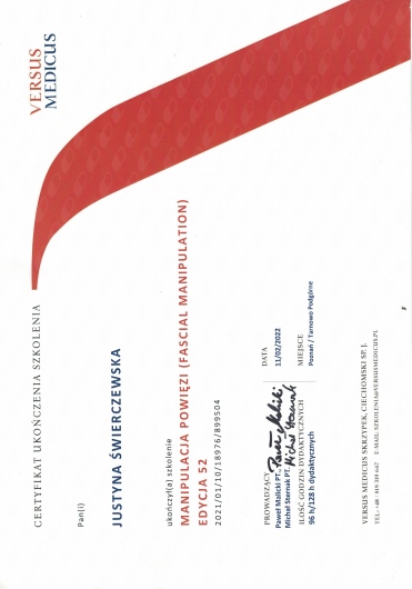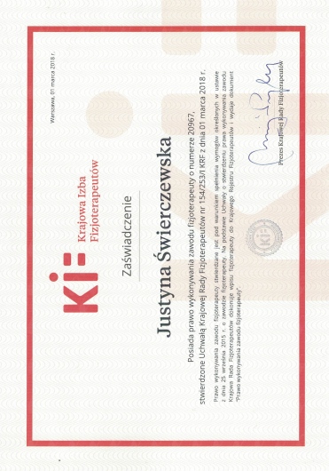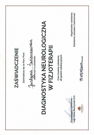 Stale się dokształcam w zakresie wiedzy fizjoterapeutycznej, jak również szeroko rozumianych nauk medycznych, rozumiejąc, że większość problemów moich pacjentów jest składową wielu procesów zachodzących w organizmie. Tą myślą kieruję się, diagnozując przyczynę zaburzeń zdrowotnych i staram się mieć adekwatny wgląd m.in. w aktywność codzienną pacjenta, rodzaj wykonywanej pracy, dietę, problemy układu pokarmowego, a także obciążenie układu nerwowego na podłożu stresowym lub emocjonalnym.