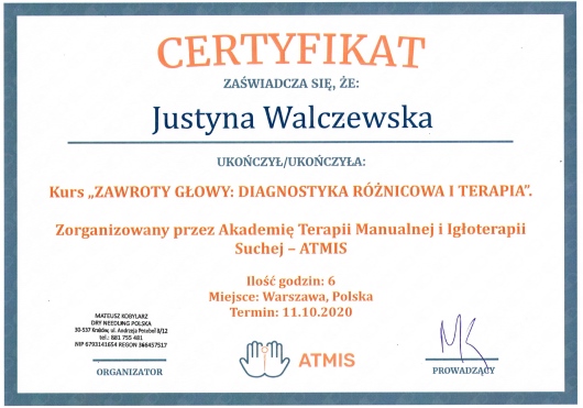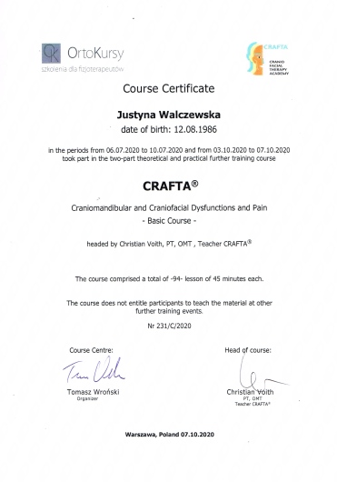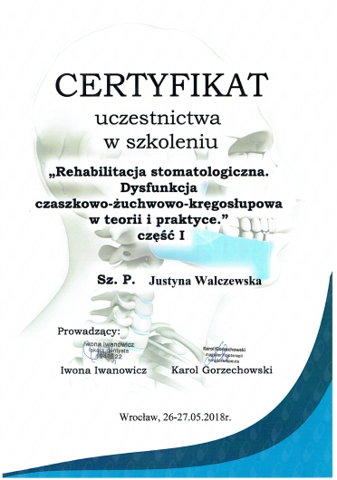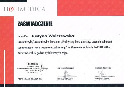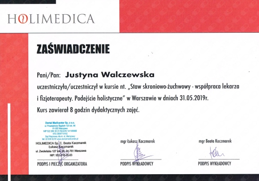 Jaki jest zakres porad oferowanych przez Justyna Walczewska?Justyna Walczewska to fizjoterapeuta. Na podstawie swojego doświadczenia i wykształcenia Justyna Walczewska oferuje usługi takie jak: konsultacja fizjoterapeutyczna, fizjoterapia stomatologiczna, Fizjoterapia stawów skroniowo-żuchwowych.