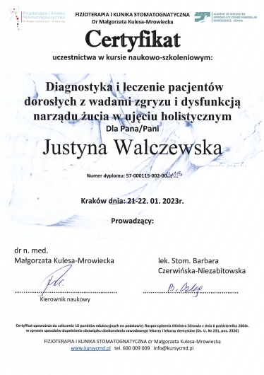 Do pani Justyny trafiłam z wieloletnim problemem zaciskania zębów, ciągłych migren i bólem pleców w odcinku piersiowym. Tak dokładnego i szczegółowego wywiadu jeszcze nikt ze mną nie przeprowadził, wiedza Pani Justyny i holistyczny sposób patrzenia na pacjenta są po prostu nie do porównania z innymi specjalistami.