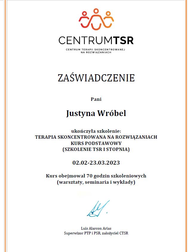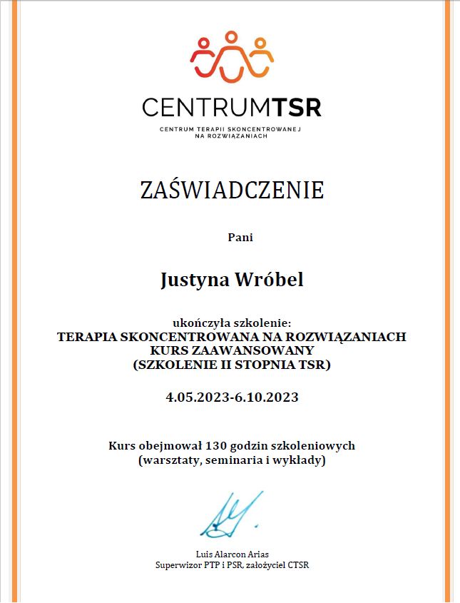 Jaki jest zakres porad oferowanych przez Justyna Wróbel?Justyna Wróbel to psycholog. Na podstawie swojego doświadczenia i wykształcenia Justyna Wróbel oferuje usługi takie jak: Konsultacja psychologiczna, Konsultacja psychologiczna online, konsultacja psychoterapeutyczna dzieci i młodzieży online, Konsultacja psychologiczna dla rodziców online, interwencja kryzysowa online, psychoterapia online.