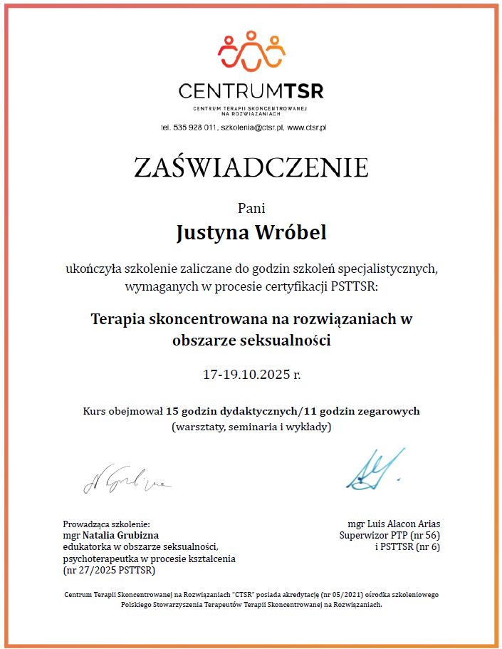 Czy Justyna Wróbel przyjmuje online, bez konieczności pojawiania się w placówce?Tak, Justyna Wróbel oferuje konsultacje online. Wybierz opcję „konsultacja online” przy umawianiu wizyty, a zobaczysz dostępne terminy.