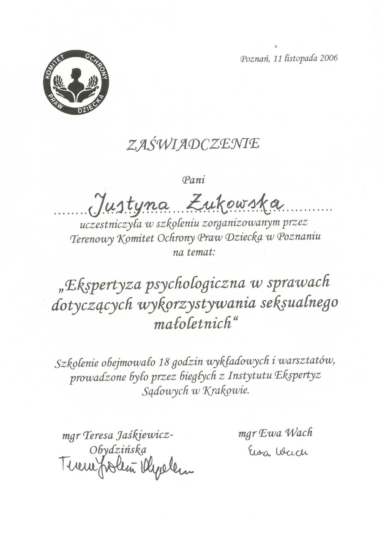 Posiadam ponad 25-letnie doświadczenie w pracy psychologa i terapeuty. Ukończyłam psychologię na Uniwersytecie im. Adama Mickiewicza w Poznaniu. Przez ponad 10 lat pracowałam w Terenowym Komitecie Ochrony Praw Dziecka w Poznaniu wspierając dzieci i rodziny w kryzysach oraz przemocowych relacjach. Występowałam jako biegła sądowa w sprawach rozwodowych, opiekuńczych i karnych, a przez 7 lat również w Zakładzie Medycyny Sądowej. Jest certyfikowaną mediatorką rodzinną i członkinią Stowarzyszenia Mediatorów Rodzinnych. Ukończyłam liczne szkolenia m.in. z terapii systemowej, Gestalt, BSFT i pracy z rodziną. Pracuję w podejściu holistycznym, łącząc metody psychoterapeutyczne z terapiami naturalnymi. Jestem współautorką programu grup wsparcia dla kobiet doświadczających przemocy oraz cyklu warsztatów „Świadoma Kobieta”. Oferuję konsultacje dla pacjentów w wieku 10 lat i starszych.