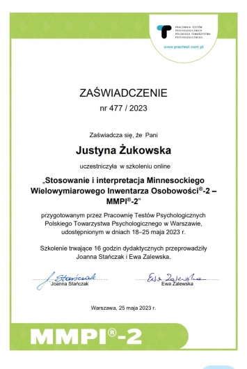 Jaki jest zakres porad oferowanych przez Justyna Żukowska?Justyna Żukowska to psycholog. Na podstawie swojego doświadczenia i wykształcenia Justyna Żukowska oferuje usługi takie jak: konsultacja online, konsultacja pary/małżeńska, interwencja kryzysowa online, interwencja kryzysowa, poradnictwo psychologiczne dla służb mundurowych, Diagnoza osobowości MMPI, Konsultacja psychologiczna, Sesja wsparcia psychologicznego, Diagnoza ADHD test diva 5.0, konsultacja psychologiczna (pierwsza wizyta).