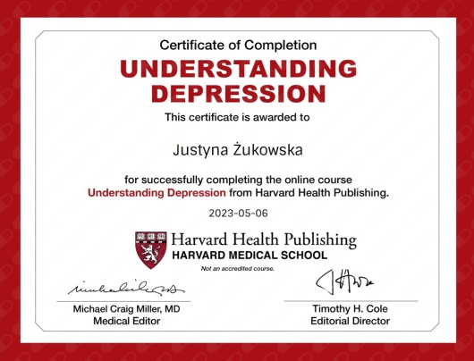 Na bieżąco uczestniczę w licznych kursach i szkoleniach podczas których doskonalę swoje umiejętności, aktualizuję wiedzę niezbędną do pracy. Stacjonarnie przyjmuję w Białymstoku, konsultacje online prowadzę dla Polonii przebywającej na terenie całego Świata.