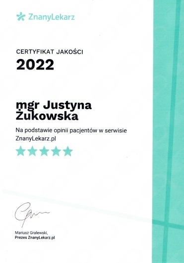 Jak Justyna Żukowska umawia wizyty?Justyna Żukowska używa kalendarza ZnanyLekarz, dlatego na stronie widzisz aktualne terminy. Wystarczy, że wybierzesz datę i godzinę, które odpowiadają Ci najbardziej. Umawianie wizyty jest darmowe, a tuż przed terminem wyślemy Ci przypomnienie.