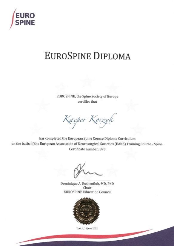Jestem członkiem indywidualnym EANS (The European Association of Neurosurgical Societies), ukończyłem EANS Training Courses: