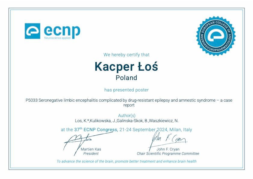 Stale podnoszę swoje kwalifikacje, biorąc aktywny udział w konferencjach krajowych oraz międzynarodowych (m.in. Congress of the European College of Neuropsychopharmacology w Mediolanie), oraz odbywając staże zagraniczne w Niemczech (szpitale Uniwersyteckie w Monachium i Essen).