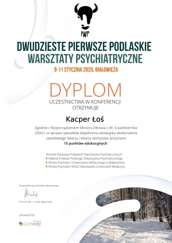 Na co dzień pracuję w Klinice Psychiatrii w Białymstoku z pacjentami dorosłymi, diagnozując i lecząc szerokie spektrum zaburzeń psychicznych.