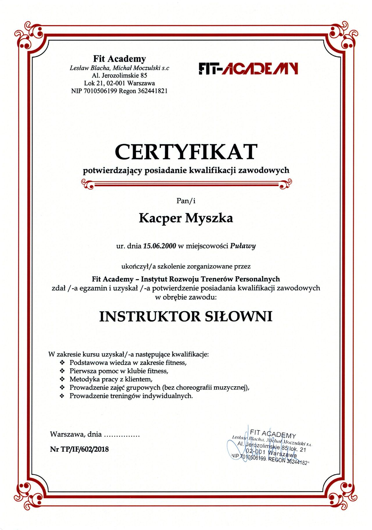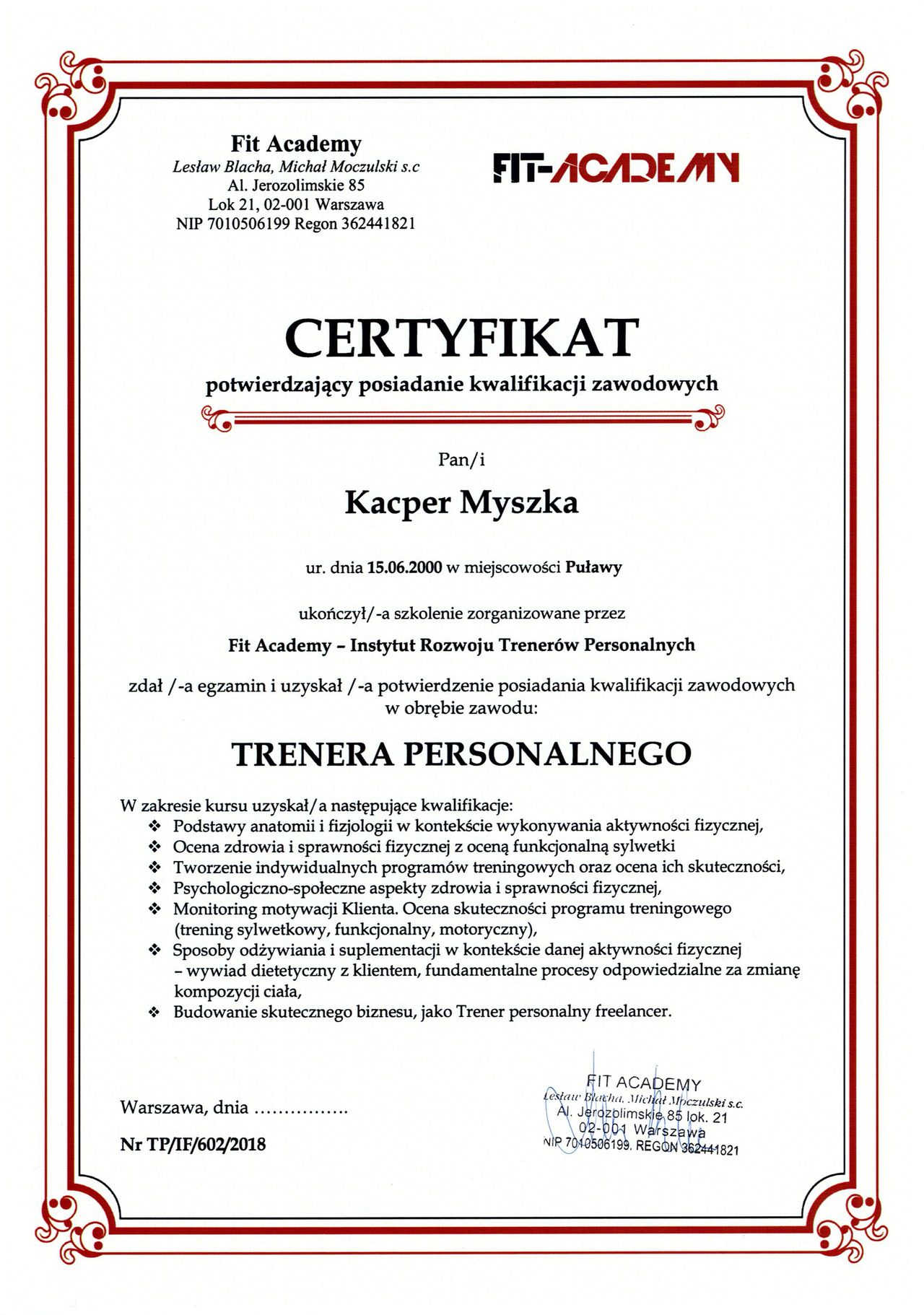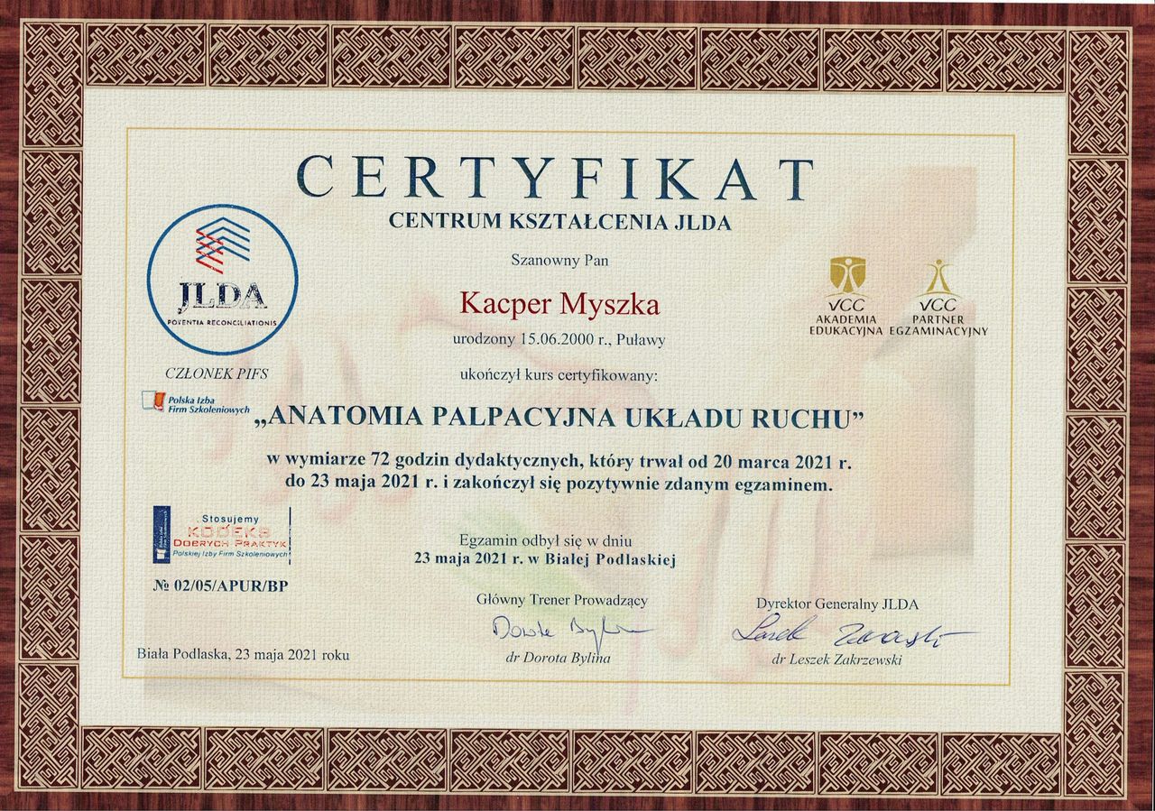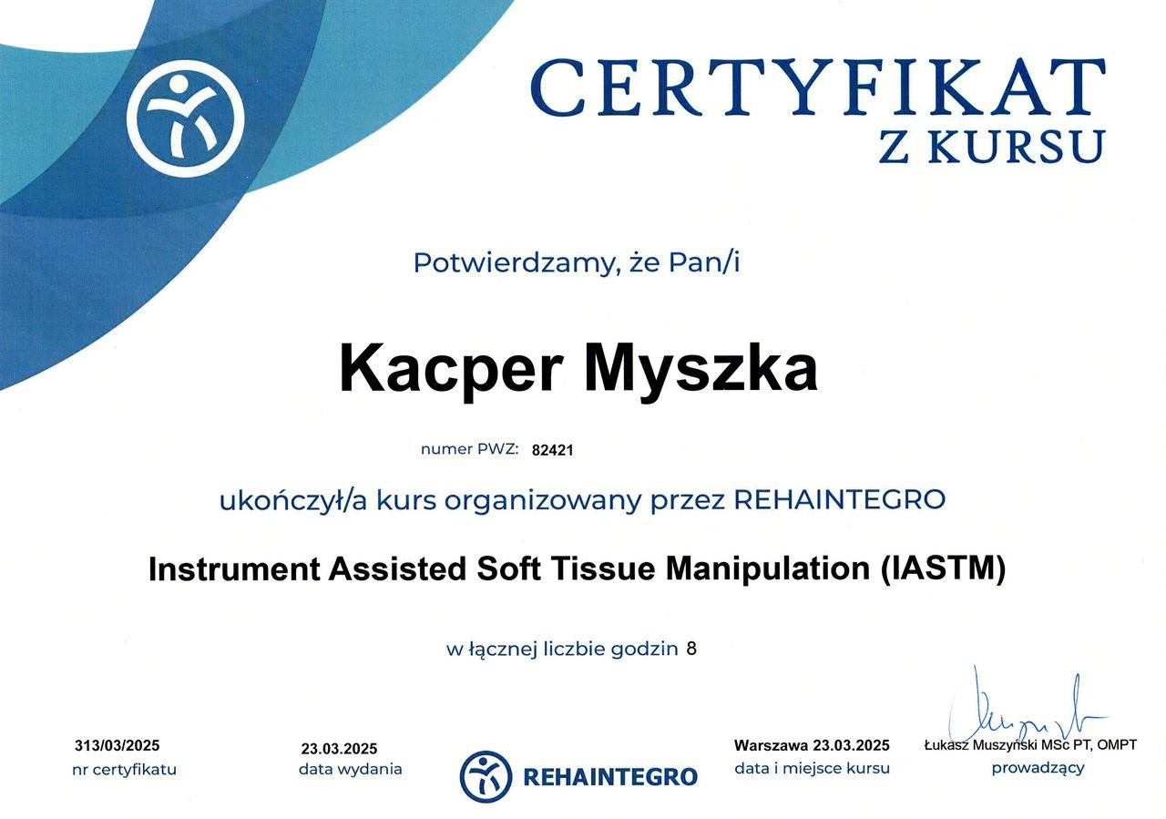 Jestem magistrem fizjoterapii, absolwentem Akademii Wychowania Fizycznego Józefa Piłsudskiego w Warszawie Filii w Białej Podlaskiej. Fizjoterapia to nie tylko moja praca - to również moja pasja. Zainteresowałem się tym kierunkiem już jako młody nastolatek, głównie z względu na towarzyszący mi w życiu sport. Jedenaście lat trenowania pływania, siedem lat gry w tenisa ziemnego, a w między czasie dodatkowo takie sporty jak badminton, narciarstwo, bieganie, siatkówka i trening siłowy. Już będąc w liceum zacząłem od szkoleń w kierunku trenerstwa personalnego i instruktora siłowni, a od pierwszych lat studiów rozwijałem swoje umiejętności uczestnicząc w licznych kursach z zakresu terapii manualnej, igłoterapii i chiropraktyki.