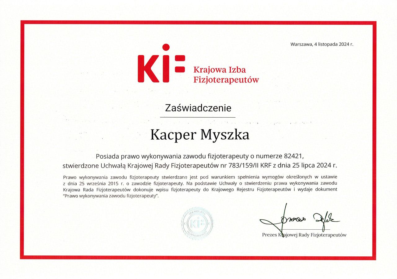 Polecam z pełnym przekonaniem Pana Kacpra innym pacjentom ze względu na jego profesjonalizm, zaangażowanie i przyjazną atmosferę przy realizacji zabiegów, które pomagają w zwalczaniu problemów ortopedycznych. W okresie 05-07.2025 korzystałem z dwóch sesji po 3 zabiegi indywidualnej kinezyterapii na kręgosłup lędźwiowy u p. Kacpra i jestem z nich bardzo zadowolony. Poza samymi zabiegami istotną rolę spełniły również w przypadku mojego schorzenia dodatkowe ćwiczenia na wzmocnienie przykręgosłupowych mięśni głębokich , które p. Kacper zalecił mi do wykonywania w domu. Pan Kacper to zdecydowanie odpowiedni człowiek na właściwym miejscu! Przy okazji życzę Mu powodzenia i satysfakcji z dalszej pracy :-)