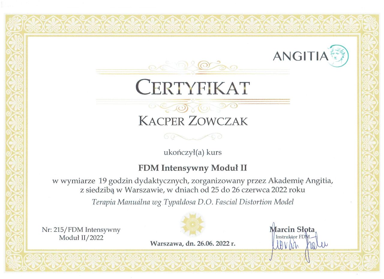 Jaki jest zakres porad oferowanych przez Kacper Zowczak?Kacper Zowczak to fizjoterapeuta. Na podstawie swojego doświadczenia i wykształcenia Kacper Zowczak oferuje usługi takie jak: konsultacja fizjoterapeutyczna, Dry Needling suche igłowanie, Fizjoterapia pourazowa, fizjoterapia przed- i pooperacyjna, fizjoterapia stomatologiczna, rehabilitacja kręgosłupa, wizyta fizjoterapeutyczna (pierwsza wizyta), badanie i fizjoterapia funkcjonalna w uszkodzeniach stawu kolanowego i barkowego, Fizjoterapia stawów skroniowo-żuchwowych, Fizjoterapia w domu pacjenta.