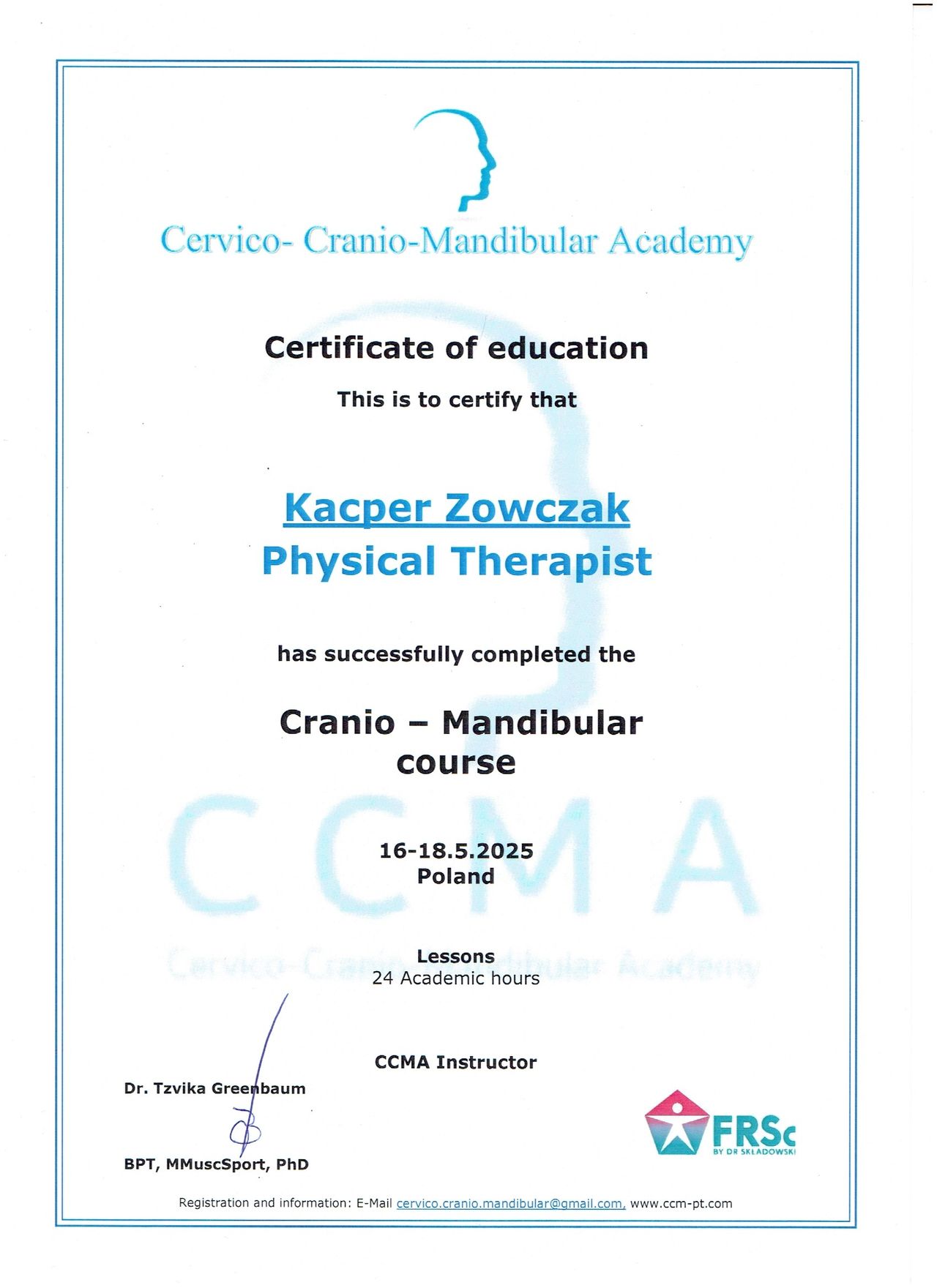 Zajmuję się również rehabilitacją w dysfunkcjach stawów skroniowo-żuchwowych (SSŻ), łącząc wiedzę z zakresu terapii manualnej i nowoczesnych technik pracy z tkankami miękkimi, aby skutecznie łagodzić ból, zredukować szumy uszne, zawroty głowy i migreny, oraz poprawiać funkcjonowanie aparatu żucia.