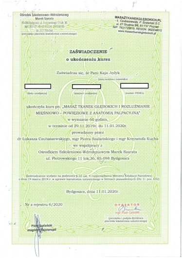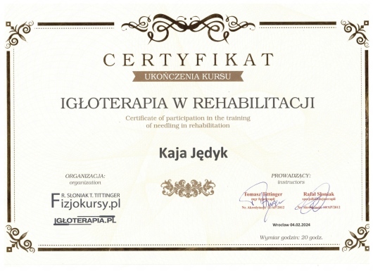 Jaki jest zakres porad oferowanych przez Kaja Jędyk?Kaja Jędyk to fizjoterapeuta. Na podstawie swojego doświadczenia i wykształcenia Kaja Jędyk oferuje usługi takie jak: Masaż leczniczy, masaż tkanek głębokich, rehabilitacja, konsultacja fizjoterapeutyczna, Fizjoterapia dyskopatii w ostrym stanie, masaż, Medyczny trening terapeutyczny, Stan ostry - Fizjoterapia, taping (plastrowanie), Terapia manualna.